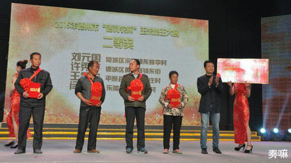 活动中,2015年德州市胜利杯小麦、德利农杯玉米粮王大赛一、二、三等奖获得者上台领奖。