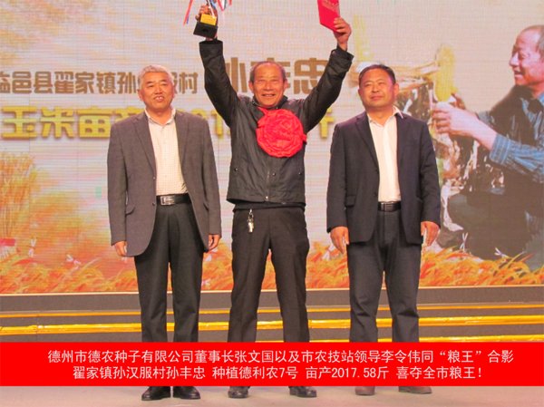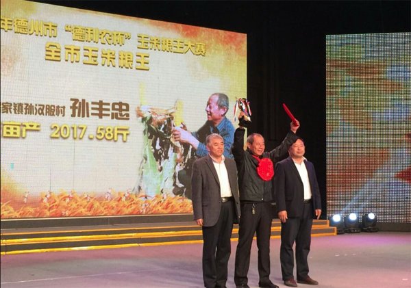 2015年德州市德利农杯玉米粮王大赛的玉米粮王 临邑县翟家镇孙汉服村的孙丰忠,种植德利农7号玉米种,亩产2017.58斤。