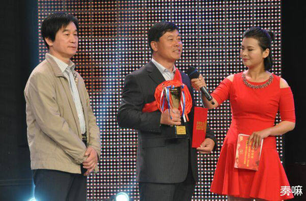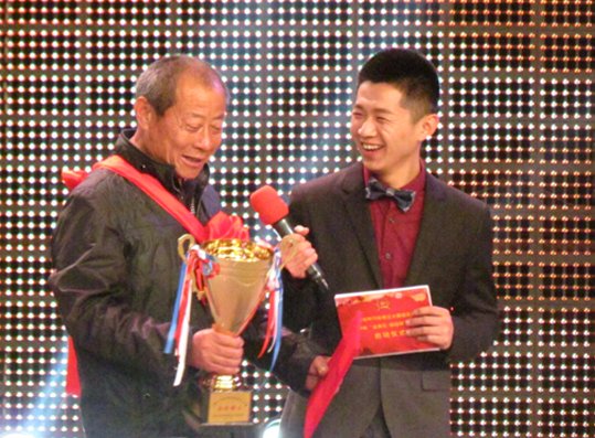 德州市农业局副局长王风延、德州广播电视台总编辑刘家权为我们的全年粮王孙丰忠颁奖。