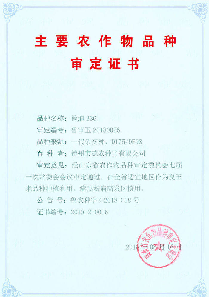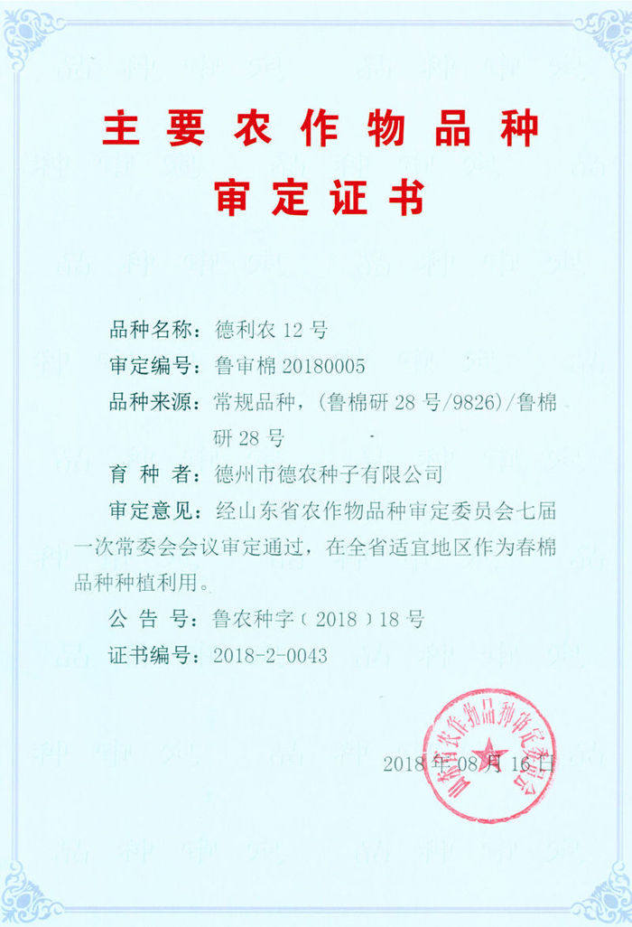 祝贺2018年德州市德农种子有限公司2个新品种通过省审,玉米品种是德迪336,审定编号:鲁审玉20180026;棉花品种是德利农12号,审定编号:鲁审棉20180005。