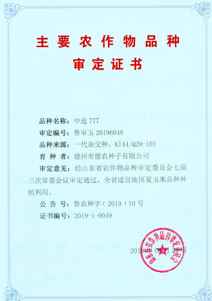 祝贺2019年德州市德农种子有限公司4个新品种通过省审,玉米品种有美德001、中选777、美德407、德迪007;小麦品种是德麦008。